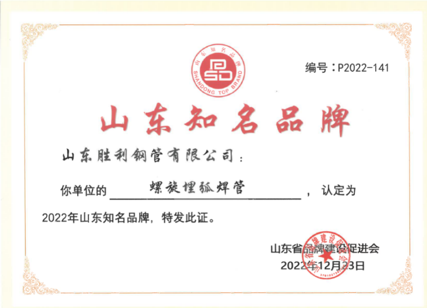 山東勝利螺旋埋弧焊管產(chǎn)品順利通過2022年度“山東知名品牌”榮譽(yù)認(rèn)證。2022年7月26日認(rèn)證工作啟動后,公司積極參加認(rèn)證工作,認(rèn)真組織各項(xiàng)申報材料,登錄認(rèn)證平臺提交申報材料,并承諾確保申報材料的真實(shí)性、準(zhǔn)確性和有效性?!吧綎|知名品牌”榮譽(yù)的獲得,將大大有助于公司螺旋埋弧焊管進(jìn)一步拓寬省內(nèi)外銷售市場,有助于爭取更多的社會市場訂單。