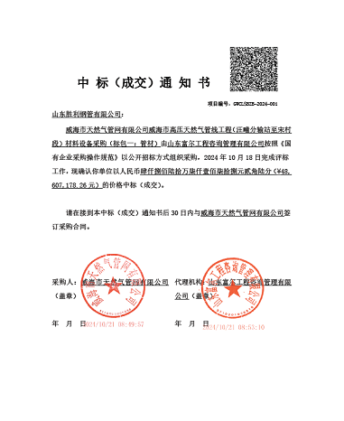 ??近日,山東勝利成功中標(biāo)了威海市高壓天然氣管線工程(汪疃分輸站至宋村段)材料設(shè)備采購的項(xiàng)目,該項(xiàng)目總量8000余噸,標(biāo)志著公司在市場競爭中再次取得了顯著成果,實(shí)力得到了市場的廣泛認(rèn)可。